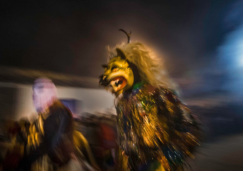 Las danzas llevan trajes y máscaras que representan a cada grupo. Las máscaras representan los personajes. Las vemos como rostros humanos vivos y muertos, muchas veces combinados con rostros de animales, como los Saqras, que son los diablos y que muchas veces son rostros, que a su vez están recorridas por serpientes…. Los materiales que se usan para su construcción vienen de generación en generación, pero van surgiendo ligeras variaciones. Tenemos máscaras o caretas de lana tejida, de yeso, cartón encolado y pintado, mallas de alambre pintadas, etc.